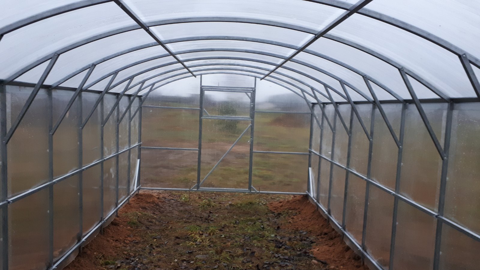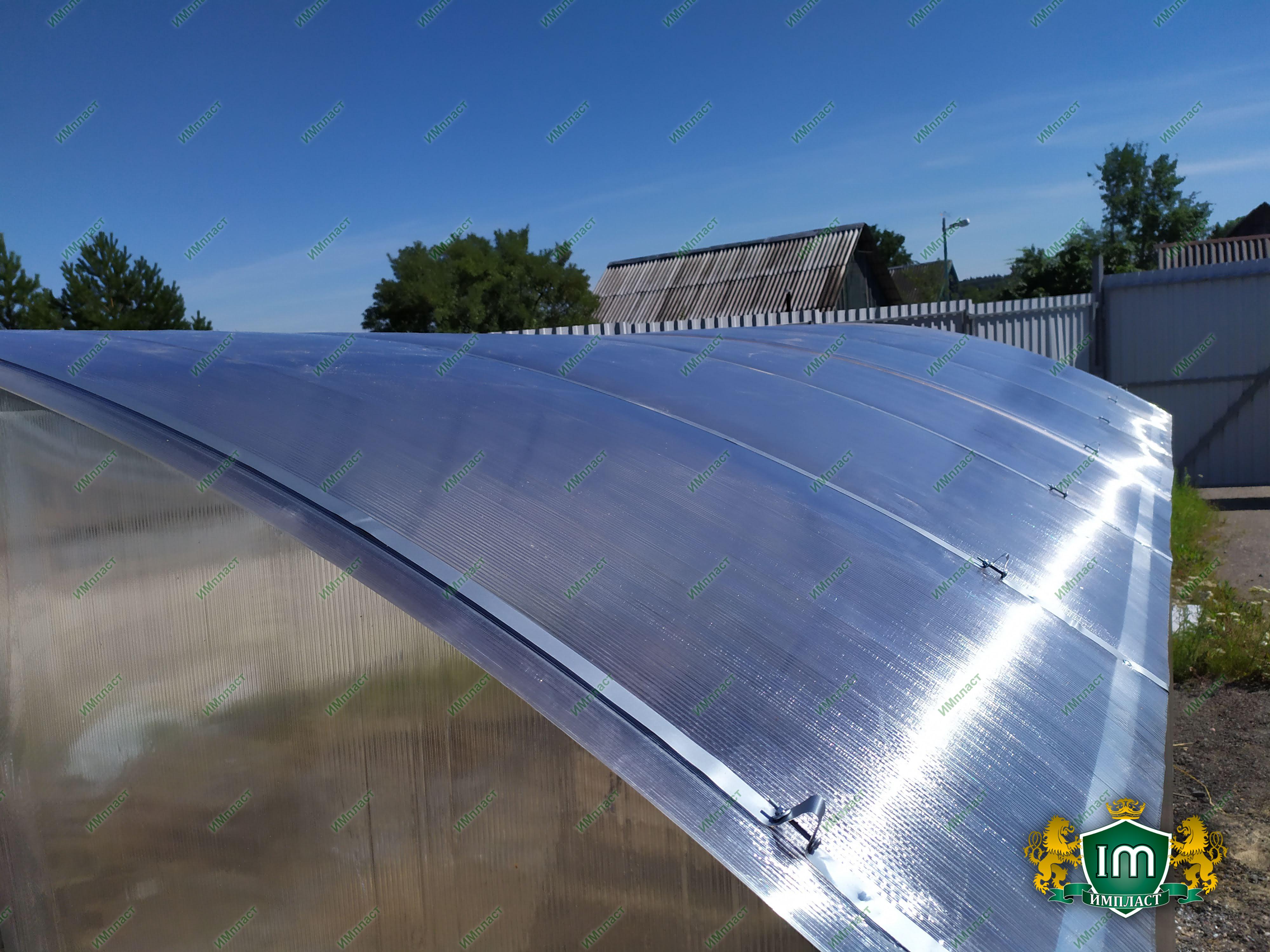 – Поликарбонат крепится на каждой арке  оцинкованной стальной лентой (не продавливается и не портится поликарбонат. На стыках плотно прижимаются листы и не затекает вода -не нужен стыковочный профиль)